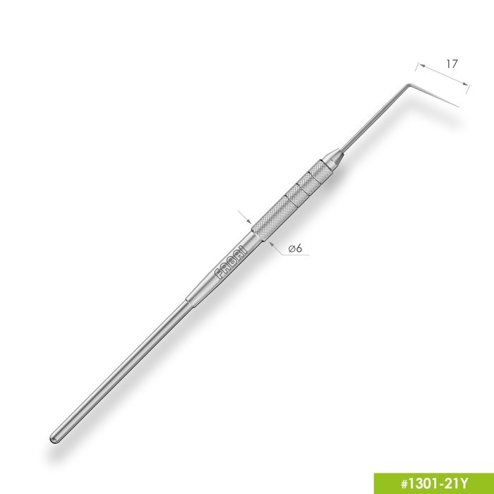 Односторонний зонд с одинарным изгибом. Предназначен для общего обследования глубоких кариозных полостей, устьевой части корневых каналов зуба и фиссур, а так же поиска полостей и микротрещин. Может использоваться на боковых и фронтальных поверхностях зубов.