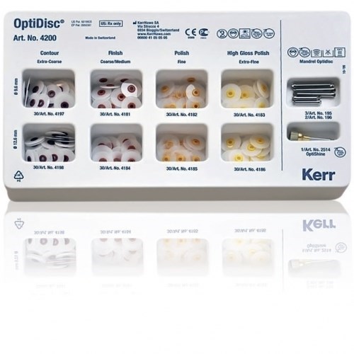 Система OptiDiscтм от Kerr представляет собой превосходную комбинацию дисков с абразивными частицами различного размера для контурирования, финирования и полировки до зеркального блеска композитов, стекло-иономеров, амальгам, полудрагоценных и драгоценных металлов.