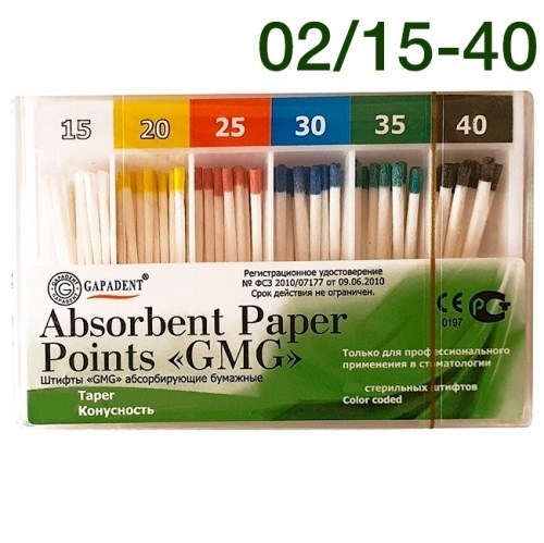 Описание: Абсорберы "GMG" 02 №15-40 (200шт), Tianjin GapadentШтифты GMG бумажные абсорбирующие бумажные штифты для подготовки (высушивания) корневых каналов зубов при эндодоническом лечении. Конусность: 02 Размер: №15-40   Применение Для пломбирования корневых каналов зубов в эндодонтии.   О материале Изготовлены из абсорбирующей бумаги высокого качества.   Преимущества Пластичны, но имеют достаточную жесткость для легкого введения в корневой канал зуба. Высокая абсорбирующая способность. Удобная цветовая маркировка. Высокая точность калибровки.   Упаковка 200шт