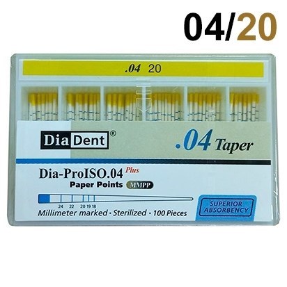 Описание: Абсорберы конусные 04 №20 (100шт.), DiaDentАбсорберы DiaDent Конусность: 04. Номер (ISO): №20. (Absorbent Paper Points)