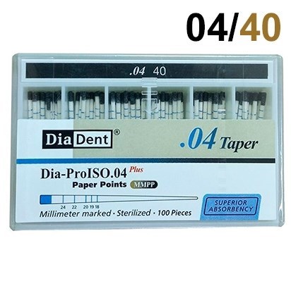 Описание: Абсорберы конусные 04 №40 (100шт.), DiaDentАбсорберы DiaDent Конусность: 04. Номер (ISO): №40. (Absorbent Paper Points)