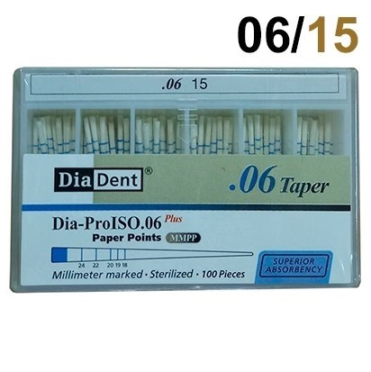 Описание: Абсорберы конусные 06 №15 (100шт.), DiaDentАбсорберы DiaDent Конусность: 06. Номер (ISO): №15. (Absorbent Paper Points)