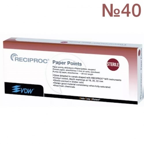 Для каждого инструмента RECIPROC (размеры R25, R40 и R50) существуют бумажные штифты RECIPROC, обладающие высокой абсорбирующей способностью.