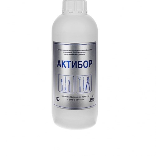 Описание: Актибор 1 л - средство дезинфицирующее (Россия)Дезинфицирующее средство, готовое к применению. Не требующий разведения готовый раствор специально для дезинфекции, в том числе и совмещенной с предстерилизационной очисткой, ротационных, эндодонтических и хирургических инструментов, сложно поддающихся очистке, ручным способом, а также механизированным способом в ультразвуковых установках любого типа, зарегистрированных в России в установленном порядке.   Состав В качестве действующего вещества содержит N,N-бис(3-аминопропил)додециламин в щелочной среде (суммарно со щелочными компонентами – 1,05% ± 0,25), а также катионные и неионогенные поверхностно-активные вещества, другие функциональные добавки; рН средства 12,8 ± 1,0.   Потребительские свойства Обладает хорошими моющими свойствами, в том числе относительно белковых загрязнений, и не фиксирует органические загрязнения; Удаляет дентин и пломбировочную массу из труднодоступных участков режущей части стоматологических инструментов; Не вызывает коррозии металлов, в том числе изделий из низколегированных и углеродистых сталей, независимо от времени обработки; Улучшает режущие свойства инструмента и продлевает срок его службы в 2-3 раза; Возможно проведение дезинфекции инструментов и материалов с подсохшими загрязнениями, без изменения режима обработки; При дезинфекции, совмещенной с ПСО, абразивных инструментов (стоматологические боры, фрезы и т.д.) ручным способом, в отличие от ультразвуковой мойки, не происходит разрушения абразивного покрытия инструмента.   Назначение Средство АКТИБОР предназначено для использования в лечебно-профилактических учреждениях стоматологического профиля и специализированных клиниках и кабинетах, в том числе в косметологических клиниках и салонах красоты: Для дезинфекции, совмещенной с предстерилизационной очисткой, ручным способом: стоматологических ротационных, эндодонтических и хирургических инструментов (боров из различных материалов, дрильборов, фрез, шлифовальных дисков, дискодержателей, эндодонтических файлов, пародонтологических кюрет и скейлеров, и т.д.); стоматологических материалов (в том числе слепков из различных материалов, слепочных ложек, артикуляторов и т.д.); косметологических и маникюрных инструментов (алмазных боров, фрез и насадок для аппаратного маникюра и педикюра и т.д.) и принадлежностей; Для дезинфекции и предстерилизационной очистки, совмещенной с дезинфекцией, вышеперечисленных инструментов и материалов механизированным способом в ультразвуковых установках любого типа, зарегистрированных на территории России в установленном порядке.   Антимикробная активность Средство АКТИБОР обладает антимикробной активностью в отношении грамотрицательных и грамположительных микроорганизмов, включая микобактерии туберкулеза В5, вирусов (включая аденовирусы, вирусы гриппа, парагриппа и др. возбудителей острых респираторных инфекций, энтеровирусы, ротавирусы, вирус полиомиелита, вирусы энтеральных, парентеральных гепатитов, герпеса, атипичной пневмонии, птичьего гриппа, ВИЧ и др.), грибов рода Кандида и Трихофитон.