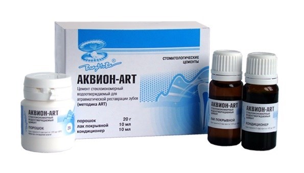 Стеклоиономерный водоотверждаемый материал «Аквион-ART» представляет собой мелкодисперсный порошок, состоящий из смеси алюмофторсиликатного стекла, полиакриловой кислоты и модифицирующих добавок. Замешивается на дистиллированной воде с образованием высокопрочного пломбировочного материала (прочность при сжатии не менее 180 МПа), обеспечивающего хорошую адгезию к эмали и дентину.
