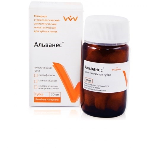 Губка «Альванес» состоит из лиофилизированного коллагена, в который введены кровоостанавливающие компоненты, влияющие на отдельные стадии свертывания крови, в частности на остановку капиллярного кровотечения, а также анестетические компоненты (лидокаин).