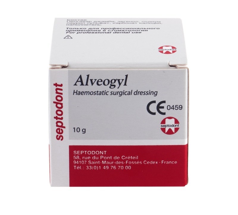 Alveogyl (Альвеожил) - паста для изготовления повязок при сухой лунке или в качестве постэкстракционной повязки после сложного травматичного удаления зуба у пациентов, имеющих в анамнезе осложнения, связанные с сухой лункой.