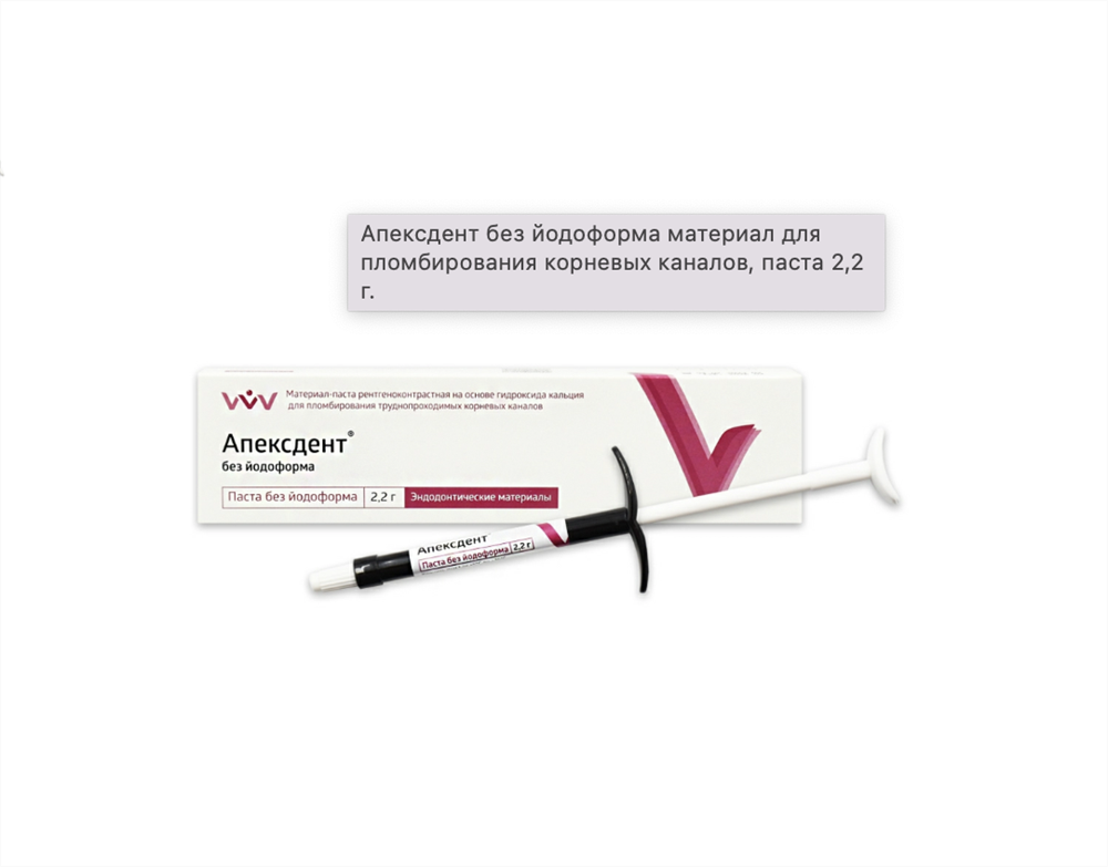 «Апексдент» БЕЗ ЙОДОФОРМА рентгеноконтрастная паста, на основе гидроокиси кальция, которая создает высокий уровень рН среды (12,5), обеспечивает стойкий, продолжительный бактерицидный эффект воздействия на оставшуюся пульпу зуба и\или систему макро- и микроканалов а, также в периапекальной области, приводит к образованию дентинно-цементного барьера, создавая условия для роста и формирования корня зуба, восстановления костной и периапекальной тканей.