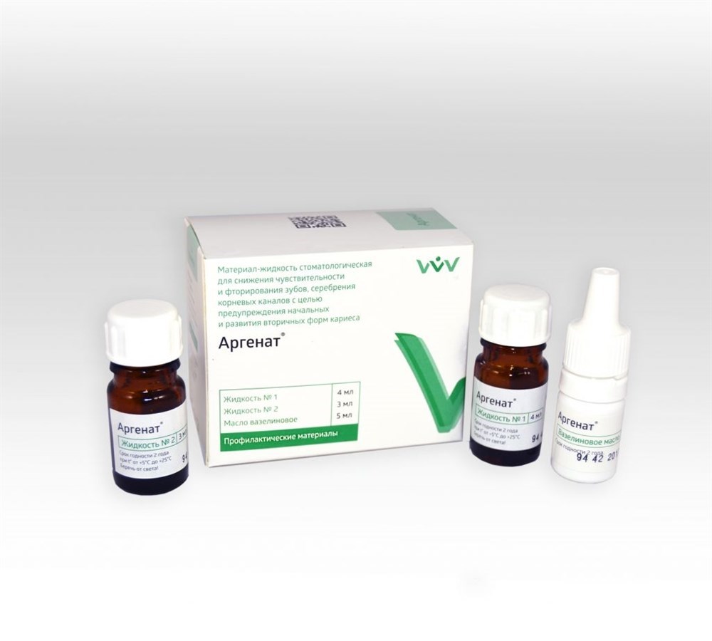 «Аргенат» двухкомпонентный - предназначен для серебрения инфицированных и труднопроходимых каналов, кариозных молочных зубов, а также зубов, пораженных пришеечным кариесом.