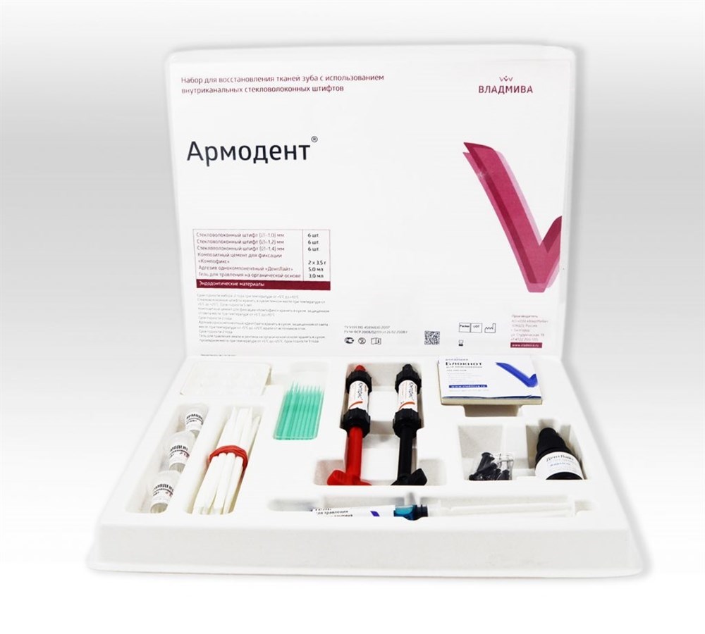 Набор «Армодент» предназначен для восстановления и усиления коронки зуба стекловолоконными внутриканальными штифтами после эндодонтического лечения (при небольшом наддесневом дефекте одной из стенок зуба) и перед протезированием. Рекомендуется применять сразу после депульпирования.
