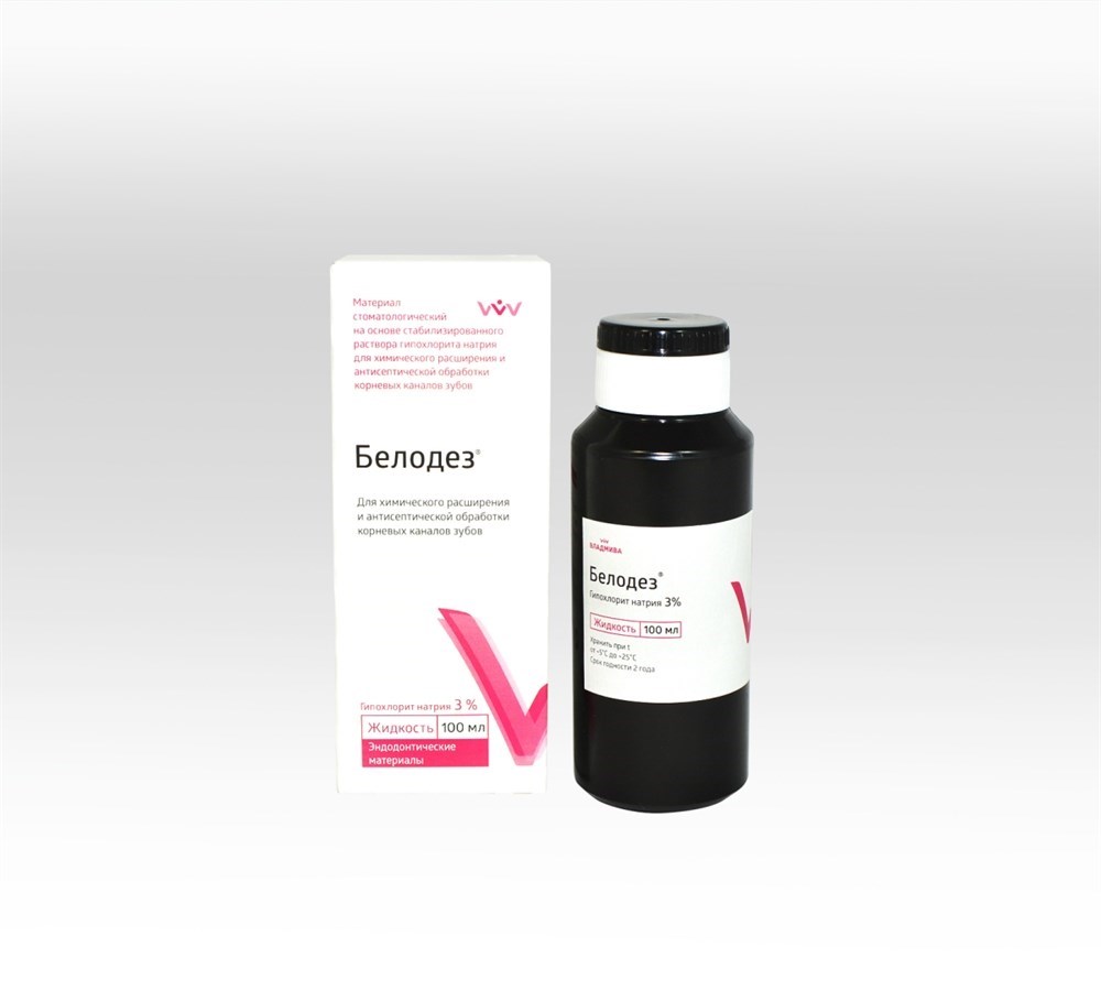 «Белодез» представляет собой стабилизированный раствор (гель) гипохлорита натрия, растворяет органическую основу дентина: как живые (химически фиксированные) так и некротизированные ткани. Гелеобразная форма выпуска позволяет успешно применять материал для антисептической обработки полостей зубов верхней челюсти, поскольку он обладает достаточной вязкостью, текучестью и щадяще воздействует на слизистую.