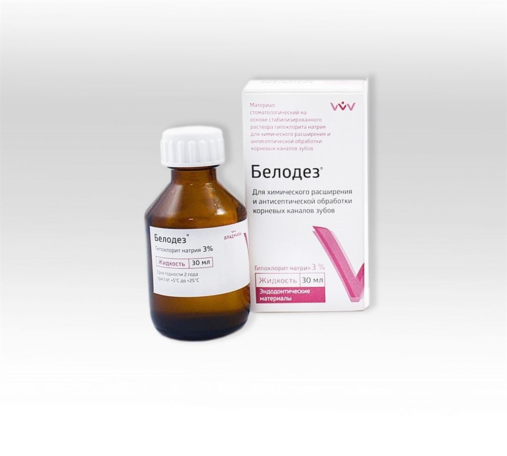 Белодез раствор 3%, 30 мл (гипохлорит натрия 3%) ВладМиВа, применяется для медикаментозной обработки корневых каналов в качестве бактерицидного, кровоостанавливающего и отбеливающего средства, для химического расширения каналов в сочетании с раствором ЭДТА. Форма выпуска жидкость 30 мл во флаконе.
