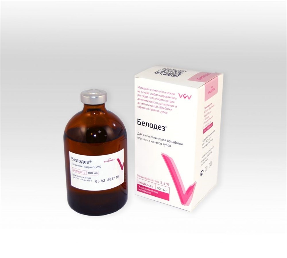 «Белодез» представляет собой стабилизированный раствор (гель) гипохлорита натрия, растворяет органическую основу дентина: как живые (химически фиксированные) так и некротизированные ткани. Гелеобразная форма выпуска позволяет успешно применять материал для антисептической обработки полостей зубов верхней челюсти, поскольку он обладает достаточной вязкостью, текучестью и щадяще воздействует на слизистую.
