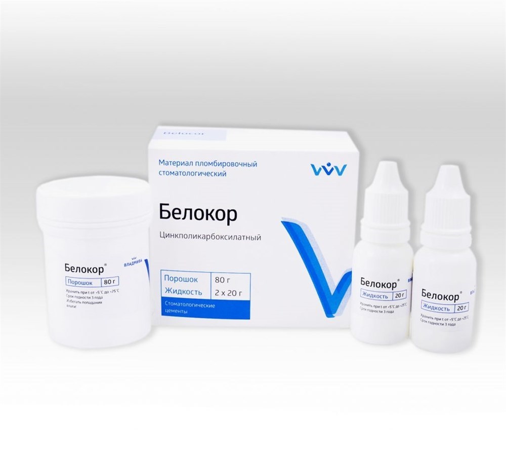 Цемент «Белокор» образуется при смешивании порошка и жидкости. Порошок представляет собой модифицированную окись цинка, жидкость - водный раствор полиакриловой кислоты.