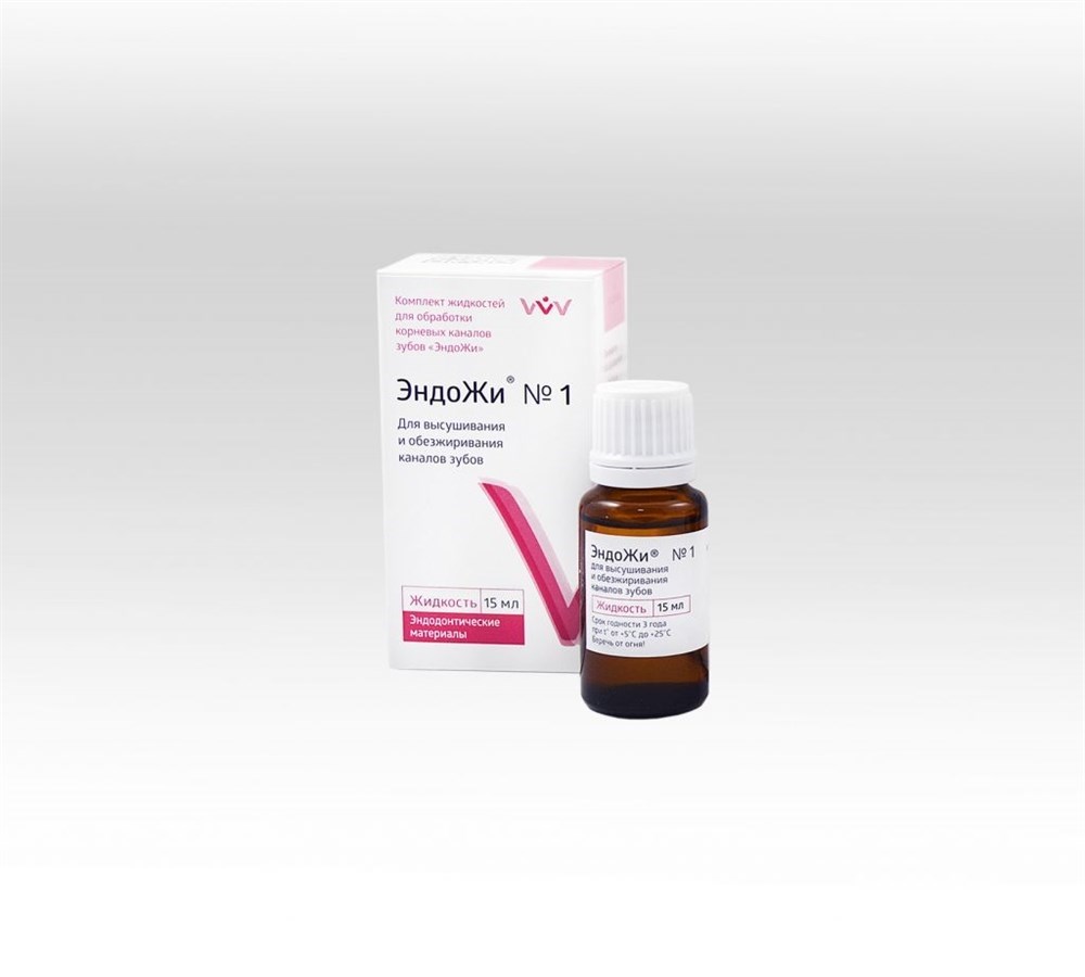 ЭндоЖи № 1 - дегидратирующая жидкость для высушивания и обезжиривания каналов, не содержит диэтилового эфира и этанола, легко испаряется. Высушивание и обезжиривание каналов происходит в течение 1 минуты без применения осушающей струи сжатого воздуха. Упаковка - флакон с жидкостью 15 мл.