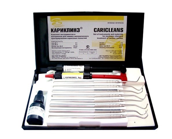 Набор гелей «Кариклинз» предназначен как в детской, так и во взрослой стоматологии для размягчения кариозного дентина при среднем кариесе и кариесе корня, без повреждения здорового дентина. Комплект специальных инструментов для ручного применения используется для удаления размягчённой ткани кариозного дентина без использования бормашины.