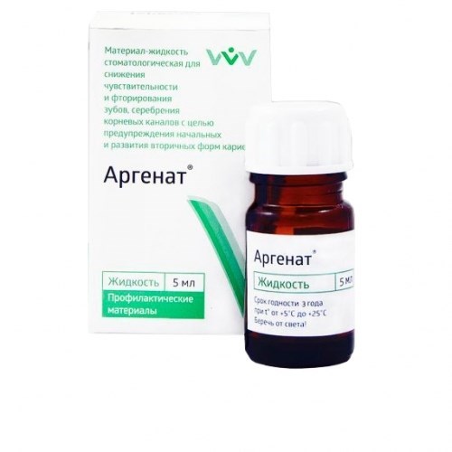«Аргенат» однокомпонентный - предназначен для фторирования и снижения чувствительности зубов (кроме фронтальных), предотвращения развития вторичного кариеса, а также для серебрения корневых каналов зубов при начальных формах развития кариозных процессов (особенно кариеса молочных зубов).