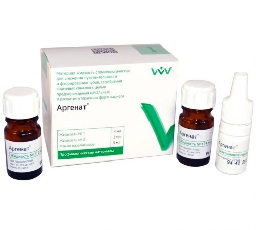 «Аргенат» двухкомпонентный - предназначен для серебрения инфицированных и труднопроходимых каналов, кариозных молочных зубов, а также зубов, пораженных пришеечным кариесом.