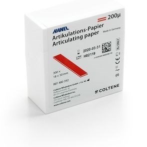 Hanel артикуляционная бумага, покрытая с обеих сторон краской, используемая в гнатологии. Обладает высоким маркирующим эффектом. При использовании на моделях может использоваться многократно, так как красящее покрытие обладает способностью к регенерации.