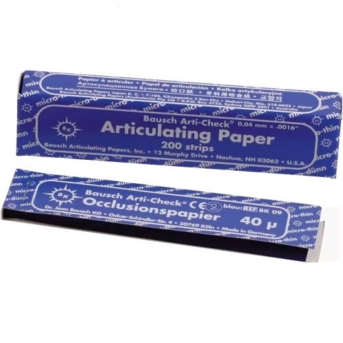 Описание: Артикуляционная бумага Bausch BK 09, 40 мкрн - копирка бауш прямая, 200л, синяяАртикуляционная бумага ВК 09 — это окклюзионная бумага Бауша микродюн, толщиной 40 мкм, которая является очень тонкой и, в то же время, прочной бумагой, покрытая с обеих сторон жидкой краской.