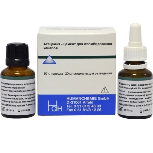 Атацамит - это щелочной цемент малой твердости с замедленным связыванием. При замешивании цемента к порошку гидроокиси кальция из жидкости для разведения дополнительно поступает большое количество гидроокиси кальция, которая образуется в результате реакции окиси кальция троичных частиц с водой. Во время длительного периода связывания в канале цемент проявляет щелочные свойства гидроокиси кальция и поливалентную дезинфицирующую активность, которая является результатом действия гидроокиси кальция и ионов меди. После завершения отвердения долговременное дезинфицирующее действие обуславливается ионами меди. Затвердевший цемент непроходим для бактерий.