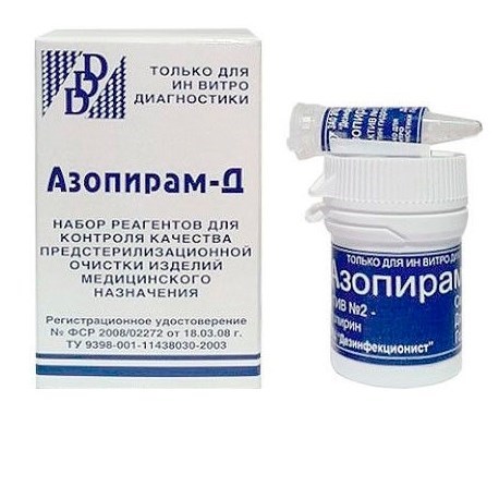 Описание: Азопирам-Д Назначение Реактив "Азопирам" используется для выявления скрытых следов крови, которые могли остаться на подготовленных к стерилизации медицинских изделиях в результате недостаточно тщательной предстерилизационной очистки. Согласно ОСТ 42-21-2-85 стерилизации должны подвергаться изделия, соприкасающиеся с раневой поверхностью, контактирующие с кровью или инъекционными препаратами, и отдельные виды медицинских инструментов, которые в процессе эксплуатации соприкасаются со слизистой оболочкой и могут вызвать ее повреждение.   Состав реактива "Азопирам" Азопирам содержит 10% амидопирина, 0,10-0,15% солянокислого анилина.   Применение реактива "Азопирам" Приготовление исходного раствора: для приготовления 1 л исходного раствора азопирарама отвешивают 100г амидопирина и 1,0-1,5 г солянокислого анилина, смешивают их в сухой мерной посуде и доводят до объема 1 л 95% этиловым спиртом.Смесь тщательно перемешивают до полного растворения ингредиентов. Непосредственно перед проверкой качества очистки изделия готовят рабочий раствор, смешивая равные объемные количества азопирама и 3% перекиси водорода. Пригодность рабочего раствора азопирама проверяется в случае необходимости: 2-3 капли этого раствора наносят на кровяное пятно. Если не позже чем через 1 минуту появляется фиолетовое окрашивание, переходящее затем в сиреневый цвет, реактив пригоден к употреблению, если окрашивание в течение 1 минуты не появляется, реактивом пользоваться нельзя. Рабочим раствором (азопирам с 3% перекисью водорода в соотношении 1:1) обрабатывают исследуемые изделия: протирают тампонами, смоченными реактивом, или наносят несколько капель реактива на исследуемые изделия с помощью пипетки. В шприцы наливают 3-4 капли рабочего раствора и несколько раз продвигают поршнем для того, чтобы смочить реактивом внутреннюю поверхность шприца, особенно места соединения стекла с металлом, где чаще всего остается кровь. Реактив в шприце оставляют на 0,5-1,0 минуту, после чего реактив вытесняют на марлевую салфетку. При проверке качества очистки игл реактив набирают в чистый, не имеющий следов коррозии шприц и, последовательно меняя иглы, пропускают реактив через них, выдавливая 3-4 капли на марлевую салфетку. Качество очистки катетеров или других полых изделий оценивают путем введения реактива внутрь изделий с помощью чистого шприца или пипетки. Реактив оставляют внутри изделия в течение 0,5-1,0 минуты, затем его сливают на марлевую салфетку. Количество реактива, вносимого внутрь изделия, зависит от величины изделия.   Срок хранения реактива "Азопирам" Готовый раствор может храниться в плотно закрытом флаконе в темноте при +4С (в холодильнике) 2 месяца, в темноте при комнатной температуре (от +18?С до +23?С) - не более 1 месяца.   Особенности и примечания Умеренное пожелтение реактива "Азопирам" в процессе хранения без выпадения осадка не снижает его рабочих качеств. Исследуемые изделия должны иметь комнатную температуру (желательно не выше +25?С). Нельзя подвергать проверке горячие изделия, а также держать рабочий раствор на ярком свету или при повышенной температуре (вблизи нагревательных приборов и т.п.). Рабочий раствор (азопирам с перекисью водорода) должен быть использован в течение 1-2 часов. При более длительном стоянии может появиться спонтанное розовое окр