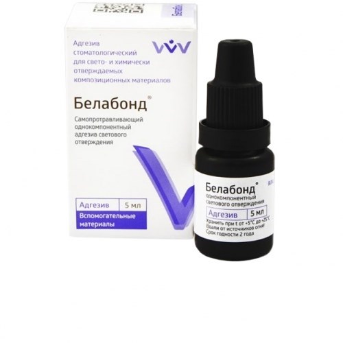 Описание: Белабонд,светоотверждаемый самопротравливающий адгезив /однокомпонентный /5мл, ВладМива  НАЗНАЧЕНИЕ Предназначены для обеспечения прочного соединения (адгезии) светоотверждаемых композитных материалов с твердыми тканями зуба. Может использоваться в сочетании с любыми светоотверждаемыми композитными материалами.   СОСТАВ И ОСНОВНЫЕ СВОЙСТВА САМОПРОТРАВЛИВАЮЩИЙ ОДНОКОМПОНЕНТНЫЙ СВЕТООТВЕРЖДАЕМЫЙ АДГЕЗИВ «Белабонд» — содержит метакрилатные олигомеры (HEMA, UDMA), активаторы полимеризации, стабилизаторы, растворители. Адгезив не требует предварительного кислотного протравливания поверхности зуба. Обладая хорошими смачивающими свойствами, самопротравливающий адгезив легко проникает в поверхностный «смазанный» слой дентина, частично растворяя его. Полифункциональные мономеры, входящие в состав адгезива, способствует образованию химической связи с тканями зуба и формированию ретенционных полимерных тяжей в дентинных канальцах. Благодаря одновременному процессу кондиционирования и диффузии, инфильтрация мономеров точно соответствует глубине минерализации.   Упаковка Адгезив 5 мл
