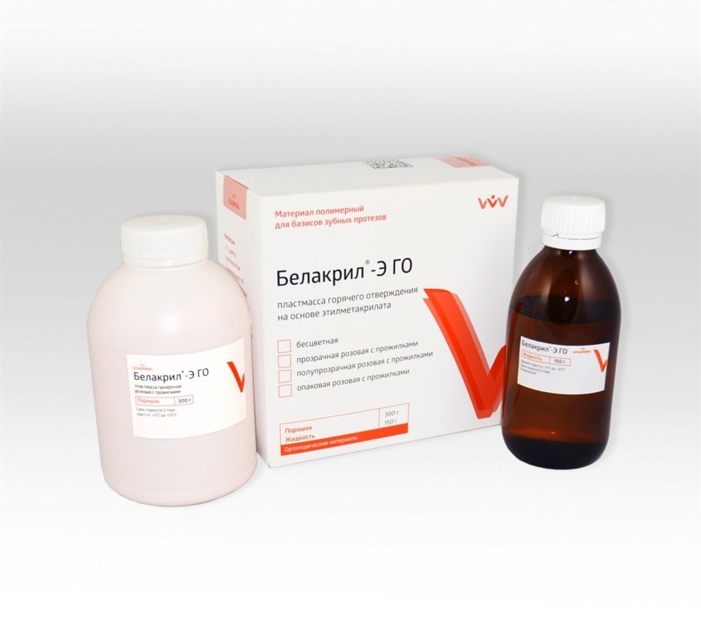 Базисные материалы «Белакрил» выпускаются в виде двух компонентов - порошка, содержащего полиэфиры метакриловой кислоты, катализатор реакции полимеризации перекись бензоила, и жидкости, содержащей мономер метилметакрилат (М) и/или мономер этилметакрилат (Э), после смешивания порошка с жидкостью образуется полимер, твердеющий при нагревании (горячего отверждения) - ГО или без нагревания (самотвердеющий) - ХО. Базисные материалы «Белакрил» отличает высокая технологичность, простота и быстрота изготовления изделий, имеющих высокое качество, функциональную долговечность, натуральный внешний вид и биосовместимость.
