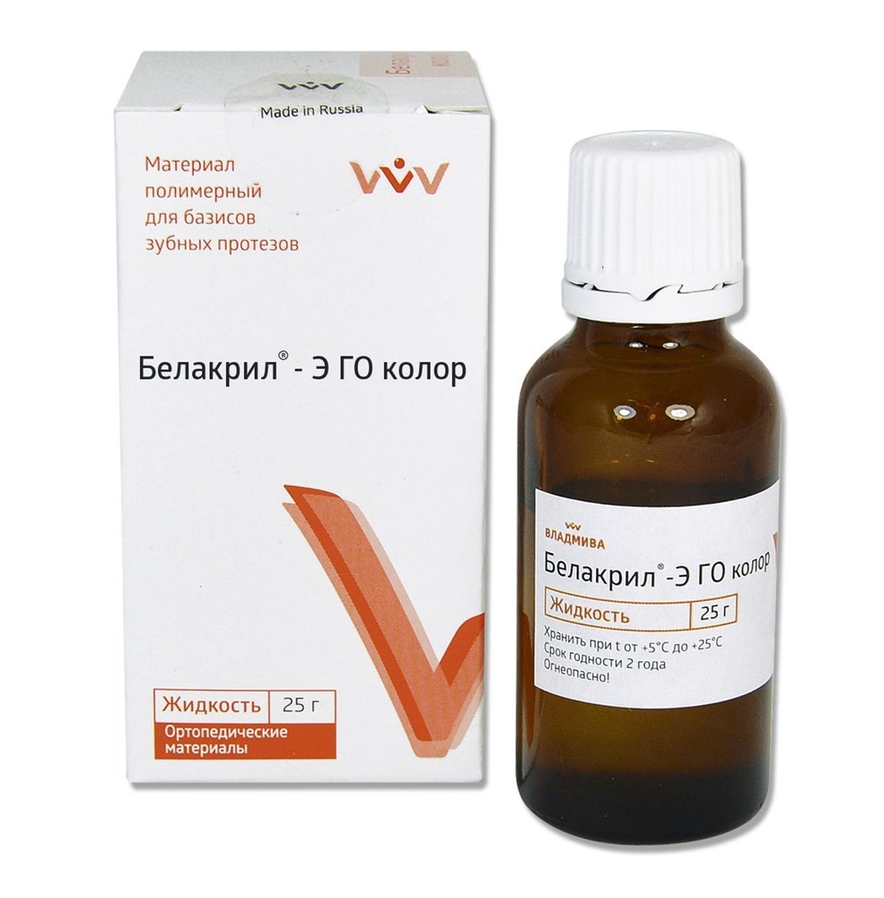 Белакрил–Э/ГО/жидкость 25 г, полимерный материал для базисов зубных протезов.