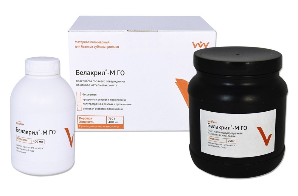 Базисные материалы «Белакрил» выпускаются в виде двух компонентов - порошка, содержащего полиэфиры метакриловой кислоты, катализатор реакции полимеризации перекись бензоила, и жидкости, содержащей мономер метилметакрилат (М) и/или мономер этилметакрилат (Э), после смешивания порошка с жидкостью образуется полимер, твердеющий при нагревании (горячего отверждения) - ГО или без нагревания (самотвердеющий) - ХО. Базисные материалы «Белакрил» отличает высокая технологичность, простота и быстрота изготовления изделий, имеющих высокое качество, функциональную долговечность, натуральный внешний вид и биосовместимость.
