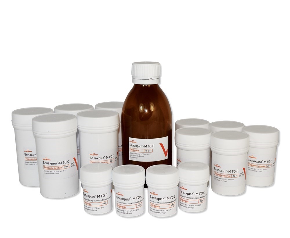 Жидкости Белакрил-М ГО С выпускаются в виде отдельного изделия и предназначены для смешивания с порошками пластмасс для несъёмного протезирования с длительным временем нахождения в пластичном состоянии.