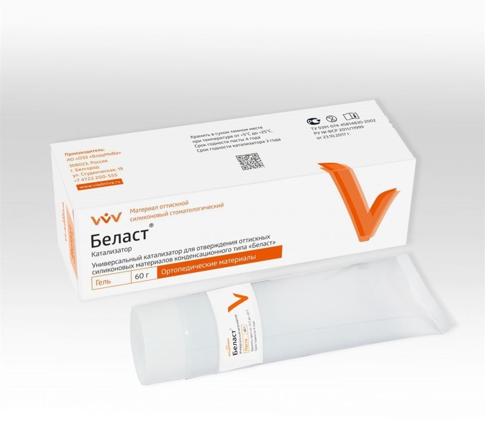 «Беласт» КАТАЛИЗАТОР — универсальный гелеобразный катализатор для конденсационных силиконовых материалов при получении точных оттисков различных твердых и мягких тканей протезного поля.