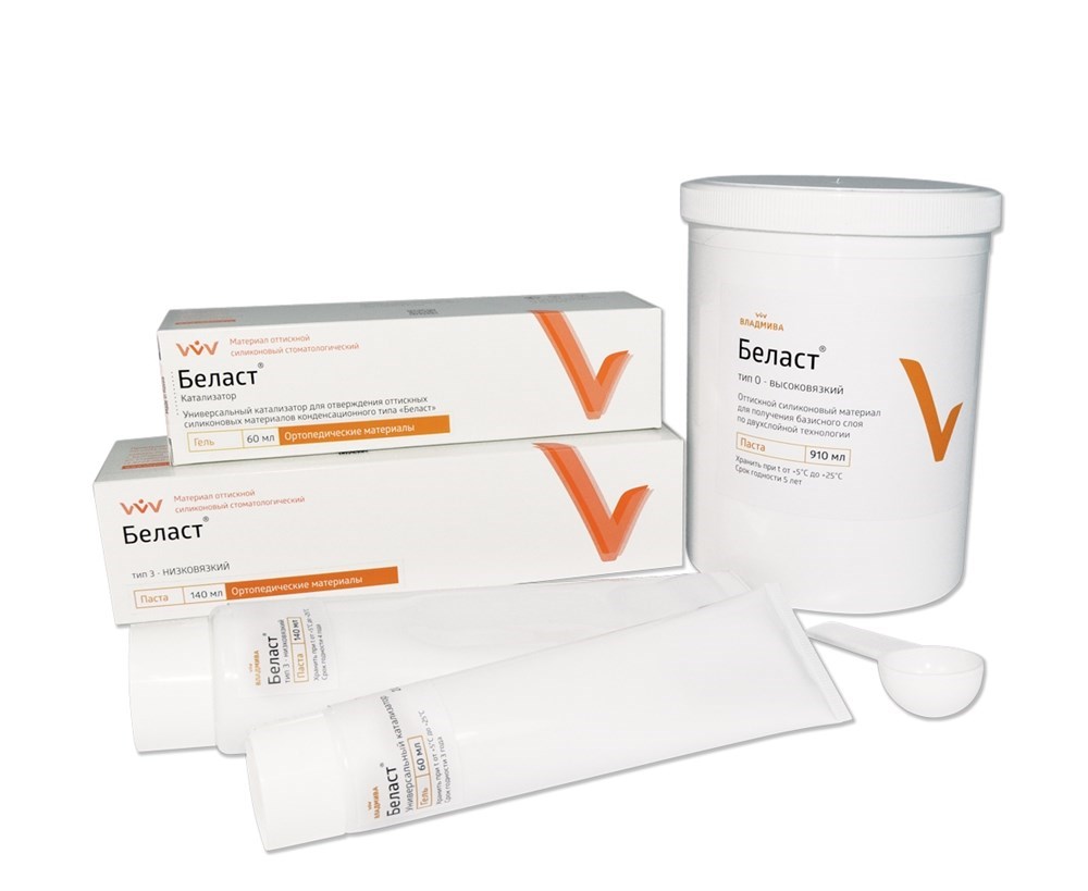 «Беласт» ВЫСОКОВЯЗКИЙ (ИСО 4823, тип 0-жесткий, тип 1-мягкий) силиконовый оттискный материал, представляющий собой наполненную силиконовую композицию холодного отверждения конденсационного типа. Материал обладает оптимальной начальной консистенцией и достаточной жесткостью после отверждения (вулканизации), высокой оттискной эффективностью и эластичностью, незначительной усадкой.