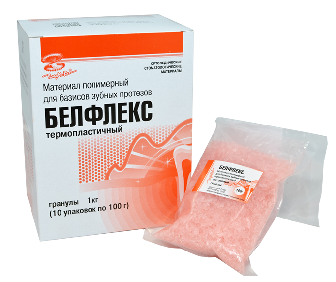Базисный материал «Белфлекс» изготовлен на основе полиамида и выпускается в виде гранул или в виде заготовок цилиндрической формы, которые могут быть неокрашенным или окрашенным в розовый цвет, с «прожилками» или без. Базисы протезов, изготовленные из базисного материала «Белфлекс», характеризуются низкой литьевой усадкой, хорошей полируемостью, небольшой величиной водоопоглощения и водорастворимости, высокой твердостью. Отличительной особенностью протезов, изготовленных из базисного материала «Белфлекс», является способность к эксплуатации без заметного образования на их поверхности налёта, требующего систематической очистки протезов.