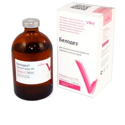 Описание: Белодез 3% (100 мл), ВладМиВа«Белодез» представляет собой стабилизированный раствор (гель) гипохлорита натрия, растворяет органическую основу дентина: как живые (химически фиксированные) так и некротизированные ткани. Гелеобразная форма выпуска позволяет успешно применять материал для антисептической обработки полостей зубов верхней челюсти, поскольку он обладает достаточной вязкостью, текучестью и щадяще воздействует на слизистую.
