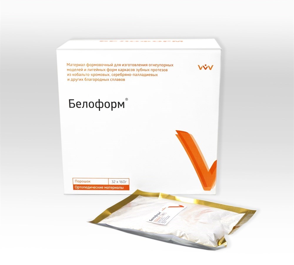 Универсальный стоматологический формовочный материал «Белоформ» содержит в своем составе фосфат, полидисперсный кварц, кристобалит, огнеупорные вяжущие вещества, а также коллоидную жидкость с модифицирующими и стабилизирующими добавками.