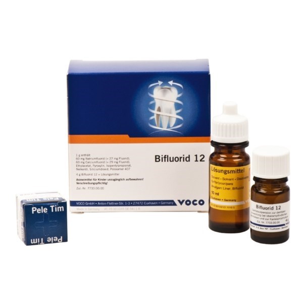 Бифлуорид 12 - это быстросохнущий лак, который надежно фиксируется на сухой эмали зуба и на дентине. Благодаря этому возможно достичь на продолжительный период времени интенсивной флюоризации подвергшихся тушированию поверхностей, например, в местах излюбленной локализации кариеса. Бифлуорид 12 образует водонепроницаемую защитную пленку, которая способствует изоляции термических и химических воздействий. Применять Бифлуорид 12 нужно для того, чтобы лак как можно дольше оставался на обработанных поверхностях и фтор лучше оказывал свое воздействие.