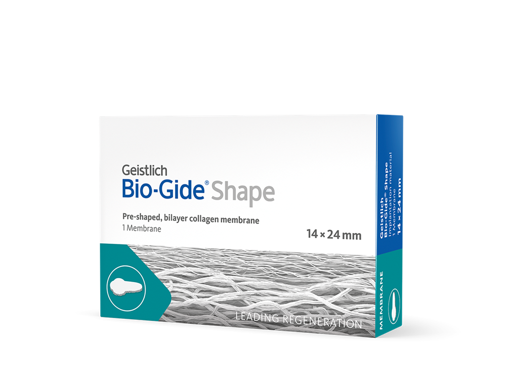 Geistlich Bio-Gide® Shape - резорбируемая двухслойная барьерная мембрана из свиного коллагена I и III типа высокой степени очистки, без поперечных сшивок для работы с лункой удаленного зуба с дефектом стенки.