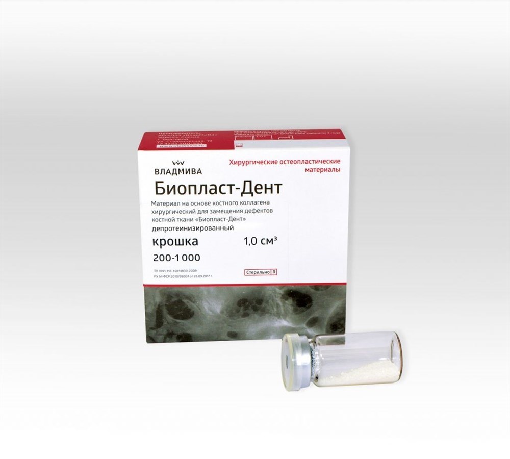 Материалы «Биопласт-Дент» представляют собой костную ткань КРС, очищенную методом химико-ферментативной обработки с сохранением гидроксиапатита биологического происхождения и пространственной архитектоники, что способствует фиксации биологически активных веществ на структурах биоматериала без снижения их биологической активности. Биоматериалы являются достаточно прочной, резорбируемой во времени матрицей (6-8 месяцев), со скоростью биорезорбции синхронизированной по времени с процессом образования новой ткани. Физиологическая резорбция протекает с образованием нетоксичных продуктов распада. Материалы являются идеальным остовом прорастания кровеносных сосудов и врастания клеток из костного ложа, т.к. обладают пористой структурой трабекулярной и диафизарной части трубчатых костей (микропоры, макропоры, гаверсовы каналы).