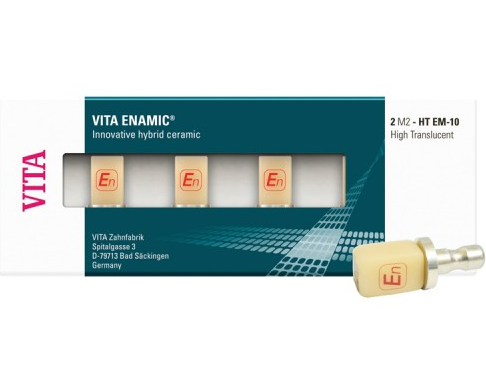 Блоки ENAMIC для Cerec/in Lab, 0M1-HT Translucent, 5 шт.(12 x 14 x 18 мм)- блоки из гибридной стоматологической керамики с двойной сетчатой структурой, которая сочетает в себе лучшие свойства керамики и композита, для машинного фрезерования в установках CEREC и inLab System. Служат не только для исполнения классических вкладок, накладок, виниров и коронок во фронтальных и боковых участках, но и для минимально инвазивных работ, таких как «Виниры без препарирования" („Non-Prep-Veneers“) или реставраций с ограниченным пространством в установках CEREC и inLab CAD/CAM System. (VITA, Германия)
