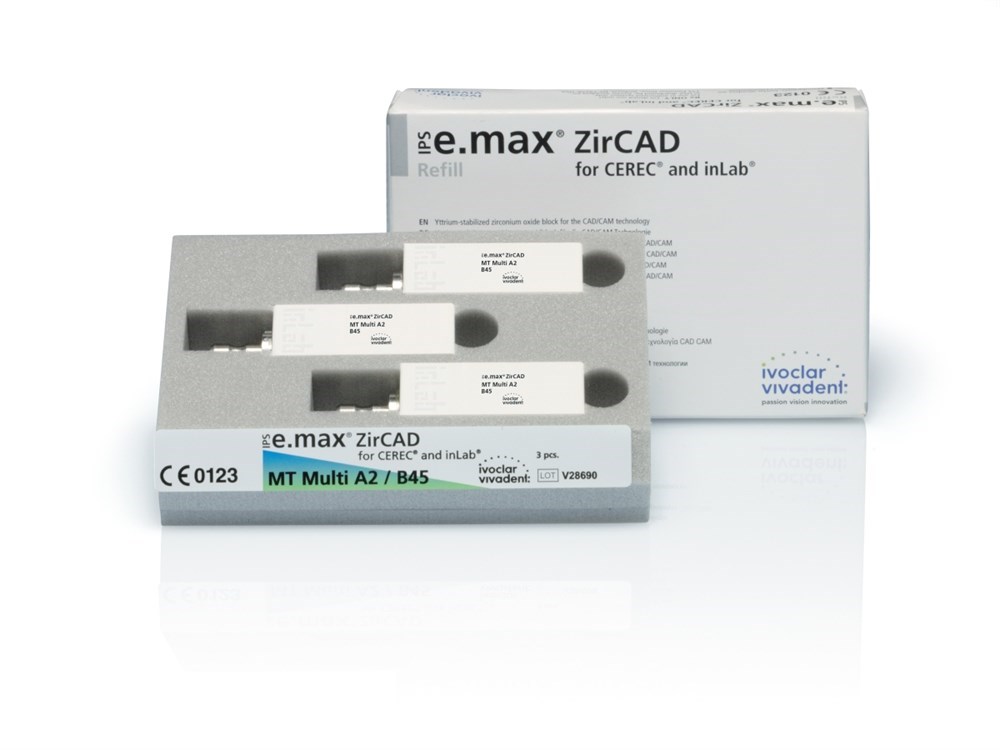 IPS e.max ZirCAD MT Multi представляют собой блоки из оксида циркония, предназначенные для изготовления высокоэстетичных коронок и мостовидных протезов на три единицы во фронтальном или в боковом отделе. Материал IPS e.max ZirCAD MT Multi доступен в блоках с хвостовиками для CEREC/InLab и Planmill, а также в дисках.