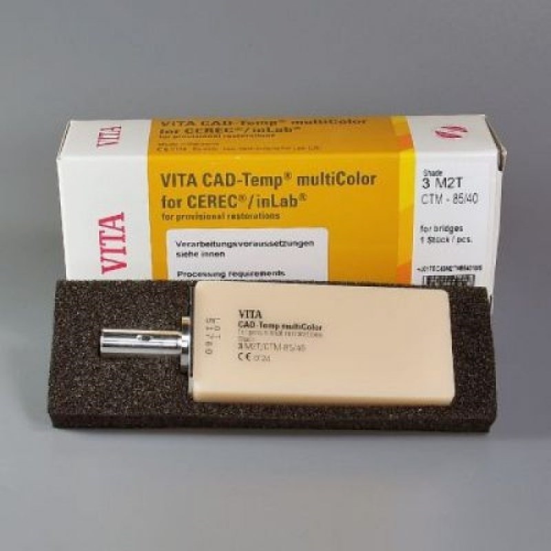 Блоки VITA CAD-Temp multiColor for CEREC/inLab, 2M2T, CTM-85/40, 1 шт. (18х40х85 мм) - акрилатный полимер с керамическим микронаполнителем для экономичного изготовления временных реставраций длительного ношения.