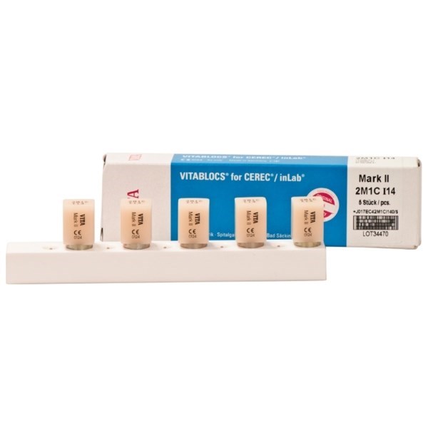 Монохромные, соответствующие цвету блоки VITABLOCS Mark II изготовлены из мелкодисперсной керамики из полевого шпата и идеально интегрируются в остаточную субстанцию зуба. Они служат для изготовления вкладок, накладок, полукоронок, фронтальных и боковых коронок, а также виниров в установках CEREC и inLab CAD/CAM System от фирмы Sirona Dental Systems.
