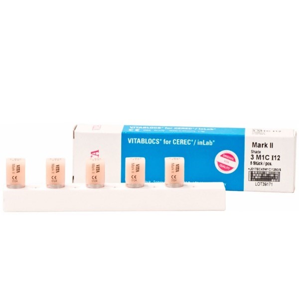 Монохромные, соответствующие цвету блоки VITABLOCS Mark II изготовлены из мелкодисперсной керамики из полевого шпата и идеально интегрируются в остаточную субстанцию зуба. Они служат для изготовления вкладок, накладок, полукоронок, фронтальных и боковых коронок, а также виниров в установках CEREC и inLab CAD/CAM System от фирмы Sirona Dental Systems.