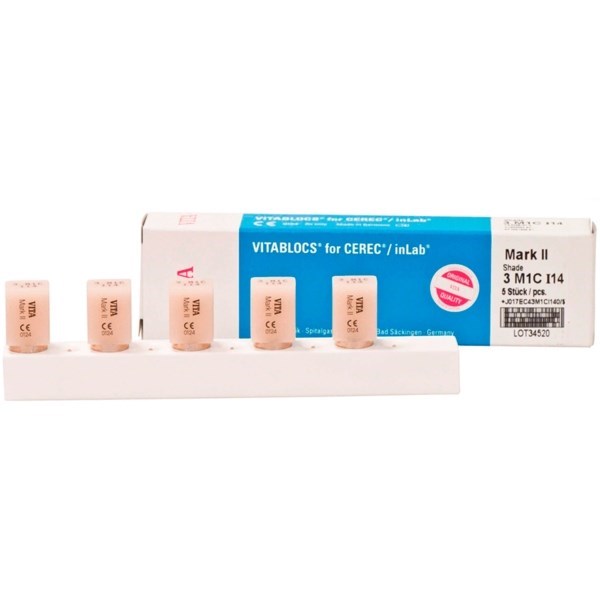 Монохромные, соответствующие цвету блоки VITABLOCS Mark II изготовлены из мелкодисперсной керамики из полевого шпата и идеально интегрируются в остаточную субстанцию зуба. Они служат для изготовления вкладок, накладок, полукоронок, фронтальных и боковых коронок, а также виниров в установках CEREC и inLab CAD/CAM System от фирмы Sirona Dental Systems.
