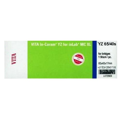 Блоки YZ из диоксида циркония для Cerec/in Lab, YZ - 65/40, для MC XL, 1 шт.(65 х 40 х 22)- cлужат для изготовления исключительно прочных цельнокерамических каркасов и многозвеньевых мостов, которые могут иметь до двух промежуточных звеньев, а также для внутренних телескопических коронок.(VITA, Германия)