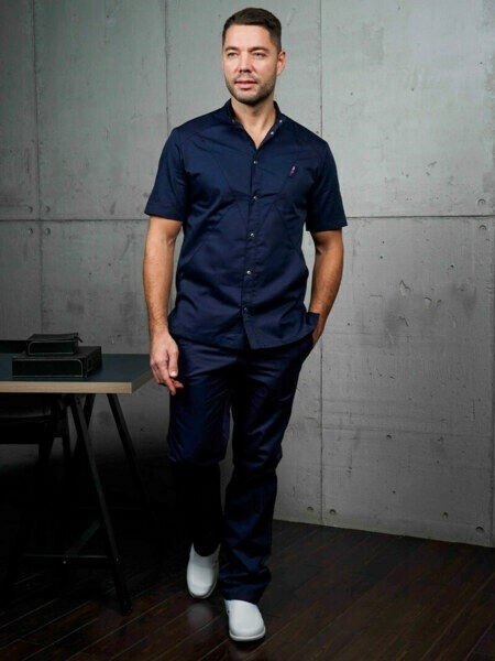 Блуза мужская медицинская "Алекс" имеет удобный короткий рукав, прямой силуэт и воротник-стойку, за счет чего комфортно садится по фигуре. Блуза Dr.Style застегивает спереди на металлические кнопки, у нее есть глубокие боковые карманы и разрезы. Ткань средней плотности, не линяет.