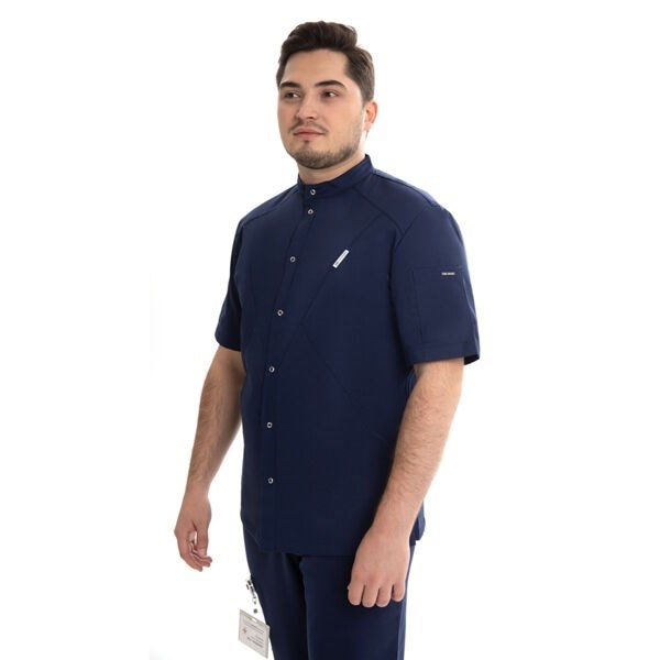 Блуза мужская медицинская "Алекс" имеет удобный короткий рукав, прямой силуэт и воротник-стойку, за счет чего комфортно садится по фигуре. Блуза Dr.Style застегивает спереди на металлические кнопки, у нее есть глубокие боковые карманы и разрезы. Ткань средней плотности, не линяет.