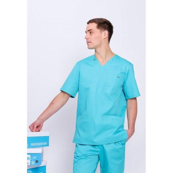 Медицинская мужская блуза "Хирург" с коротким рукавом имеет прямой силуэт и V-образный хирургический вырез. Модель дополнена разрезами по бокам, двумя функциональными накладными карманами и одним нагрудным карманом с отделением под ручку.