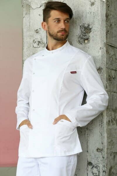 Блуза мужская медицинская "Олимп" белого цвета имеет длинный рукав, прямой силуэт, боковые карманы и воротник-стойку. Модель дополнена плечевой застежкой на кнопках, нагрудным и боковыми карманами, а также разрезами по бокам. За счет стильного кроя с асимметричной застежкой на кнопках блуза выглядит оригинально и необычно.